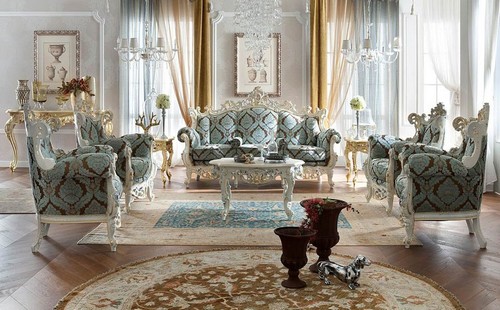 Общая цветовая гамма - белая мебель в сочетании с позолотой и пастельными тонами обивки и стен, или, тоже очень распространенный вариант, мебель цвета натуральной благородной древесины с бронзовой отделкой и сине-зелеными или пастельными оттенками текстиля в обивке, шторах. Специально созданный по новым технологиям текстиль, сохраняющий все декоративные свойства, присущие классическим образцам, имеет большую цветовую палитру и высокую прочность. Разнообразные ткани: шелк, атлас, хлопок, вискоза, парча однотонные или с классическими рисунками хорошо сочетаются с формой мягкой мебели и цветом древесины.