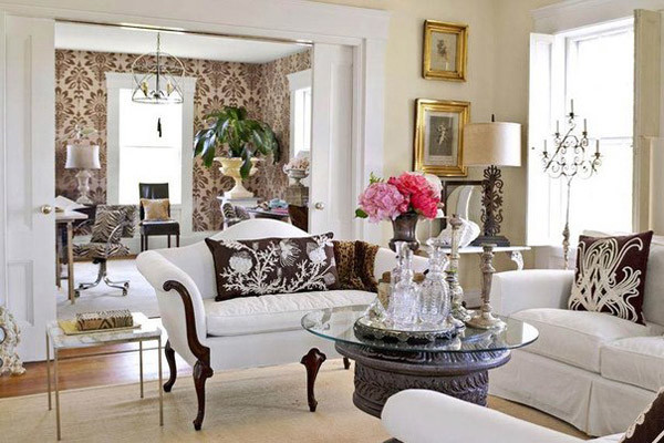Единство интерьера не нарушала вычурная мебель с инкрустациями. К изящным столикам и пуфикам на тонких гнутых ножках удивительно шли фарфоровые безделушки, ларчики, табакерки, флакончики. В моду вошли фарфор и перламутр. Если говорить о цветах, то для этого стиля были характерны так называемые пенистые пастели с кораллово-розовыми, серо-голубыми, нежно-зелеными, лавандовыми и бледно-желтыми оттенками.