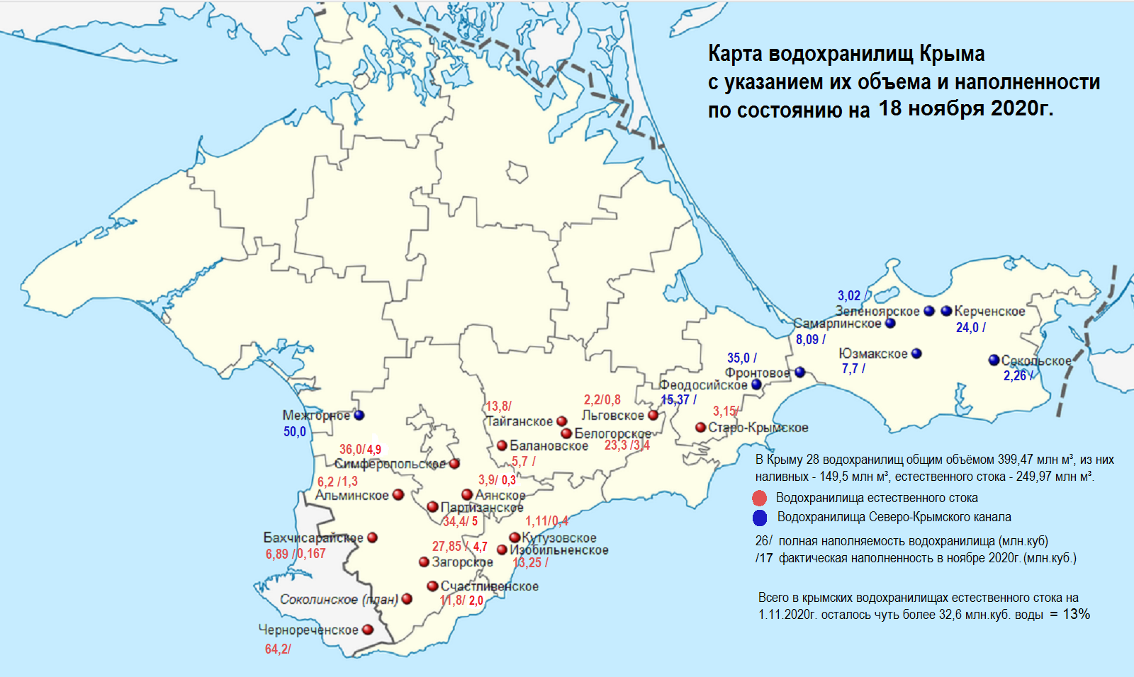 13 октября 2020г. власти Севастополя заявили, что имеющегося запаса воды хватит только до 1 января 2021г. В декабре проблему водоснабжения Севастополя временно решили переброской воды из Кадыковского карьера и резервуара у горы Гасфорта в Чернореченское водохранилище и