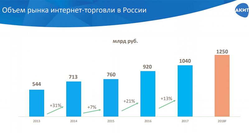 По итогам 2017 года объем российского рынка онлайн-ритейла преодолел отметку в 1 трлн руб., подсчитала Ассоциация компаний интернет-торговли (АКИТ). Согласно прогнозу АКИТ, по итогам 2018 года российский рынок электронной торговли увеличится до 1,25 трлн руб. на текущий год. Таким образом, ожидается ускорение роста рынка интернет-торговли в России примерно на 20%.