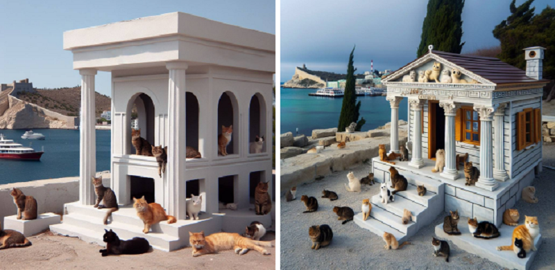 То, что вы видите на картинках, — примерные варианты, какие домики для кошек мы сделаем. Эти эскизы сделали при помощи нейросетей.