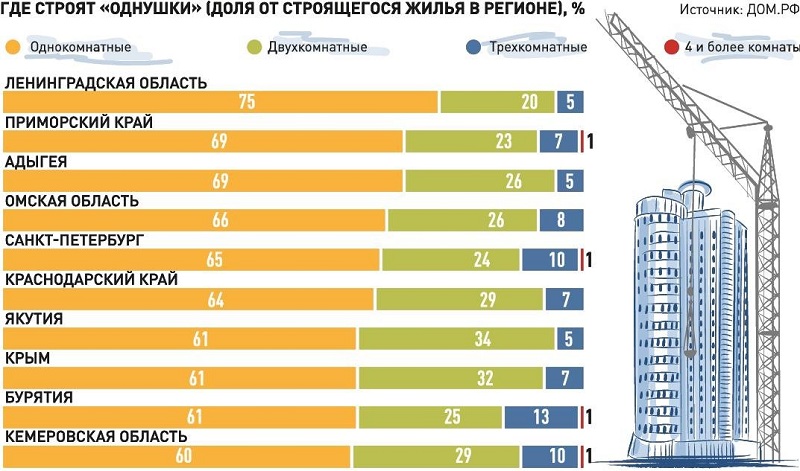 В десяти регионах - Якутия, Приморье, Крым, Омск, Санкт-Петербург, Ленинградская и Кемеровская области, Кубань, Бурятия, Адыгея - доля "однушек" в новостройках превышает 60%. И только в восьми регионах, среди которых Карелия, Дагестан, Сахалинская область, Пермский край и другие, таких квартир в новых домах менее 40%.